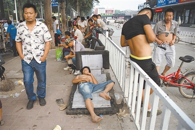 8月11日清晨6时30分左右,一位农民工在嘈杂的马路边熟睡。