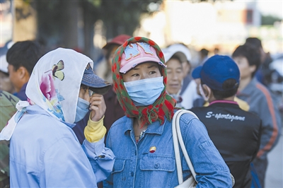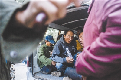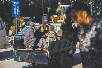 凌晨5时左右,天已大亮,负责接送农民工的吕亮将面包车停好后,扯开嗓子朝人群大喊:“小工,小工,一天120元。”几位睡在远处停车场里的农民工被嘈杂的人群吵醒了,他们从地上爬起,伸了伸懒腰,便麻利地收拾好铺盖卷,朝劳务市场走去。随着车辆和人群的不断增加,本就不宽的马路开始变得拥挤,开往北京方向的绿色公交车不停地鸣笛,但拥堵的人群丝毫没有要躲闪的意思。
