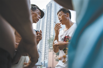 图右:8月11日早上,一位农民工正与工头讨论今天的工作和工资。