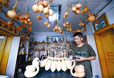 河北省大城县大流河村的崔海东,是崔氏绾结葫芦技术第五代传人。绾结葫芦所用的葫芦品种是长柄葫芦,通过对葫芦生长过程进行人工控制,选择适当时机,软化葫芦,采取单个葫芦柄绾成结,或将几个葫芦绾结在一起,塑造出一个别致的造型。