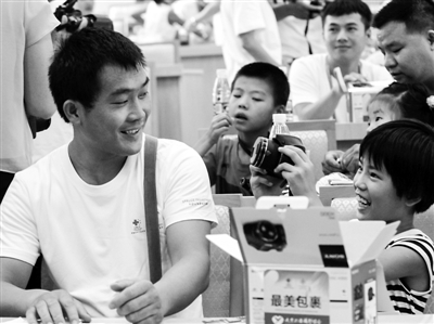 8月15日,刚刚获得相机的“小候鸟”为家长“拍照”。