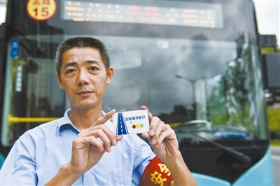 8月15日,公交车司机朱汉彬展示“电子标识卡”。