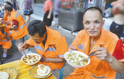 8月14日,早上7点,西安市光华路上的一家泡馍店内,环卫工人橘黄色的身影格外显眼。