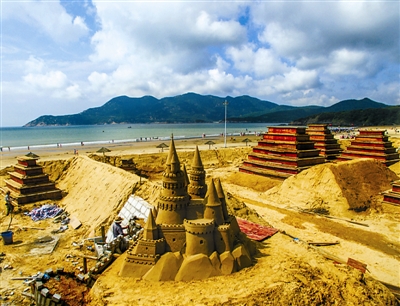 8月16日,“沙绘G20”舟山国际沙雕展在浙江舟山朱家尖南沙景区正式开雕,为即将在浙江杭州举行的G20峰会增添气氛。 新华社记者 徐昱 摄