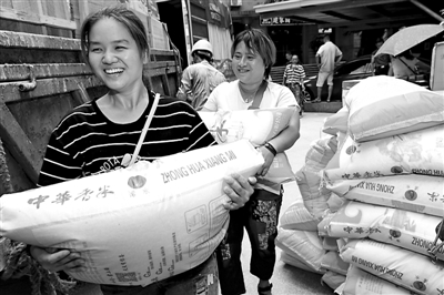 8月16日,闽清县梅城镇溪口社区受灾群众在救灾物资发放点领取大米。