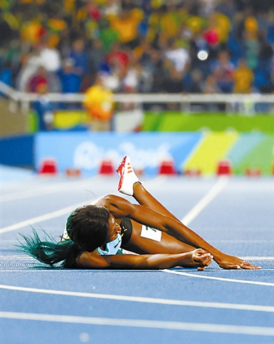 8月15日,在2016年里约奥运会田径女子400米决赛中,巴哈马选手米勒以49秒44的成绩获得冠军。图为米勒冲刺时摔过终点线。
