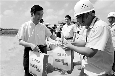 8月12日,江苏省总工会和省铁路办领导一行来到中铁上海工程局徐宿淮盐铁路工地,对奋战在高温一线的施工人员进行慰问,并将近2万元的防暑降温物品发放到一线施工人员手中。蔡祥重 崔国权摄
