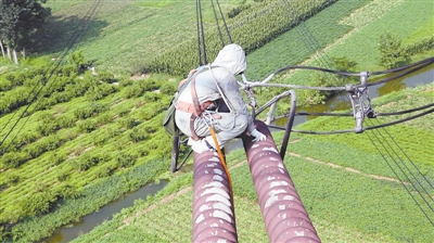 8月12日15:00,气温35摄氏度,地面温度41摄氏度,国网山东电力检修公司的王进等3名带电作业人员正穿着密不透风的屏蔽服,爬上30多米的500千伏邹枣线#89铁塔。