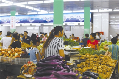 暑假的菜市场里,每天都能看到很多和家长一起出摊卖菜的孩子。曲欣悦 摄