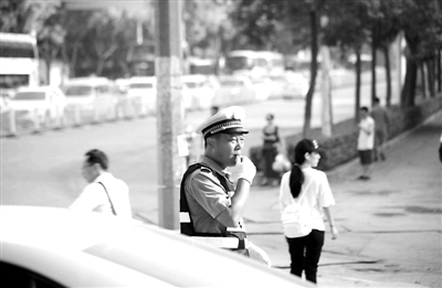 “队里规定在执勤时不准发生吃饭、抽烟、站树阴、倚靠等行为,高温、降雨等情况也必须值守在岗位,不时会有警纪暗访组流动查岗。”王验正说。