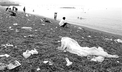 8月10日清晨,大连市开发区南砣子浴场岸边垃圾遍地。据保洁人员介绍,这些垃圾都是昨晚8点以后来海边游玩的游客丢下的。保洁工每天早上都要清理大量垃圾。