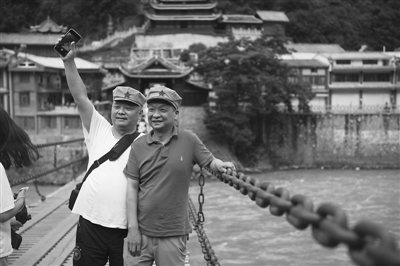 四川省甘孜藏族自治州东南部的泸定县,两位退伍军人戴上红军帽在泸定桥上合影留念,缅怀革命先烈。今年是红军长征胜利80周年,在长征沿途的瑞金、会昌、遵义、泸定等地,以“重走长征路”为主题的红色旅游吸引了众多游客。本报记者 吴凡 摄