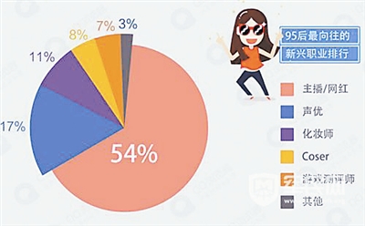 QQ浏览器于近期发布的《95后迷之就业观!》大数据报告显示, 主播/网红占54%,网络直播的火爆催生年轻人就业新趋势。