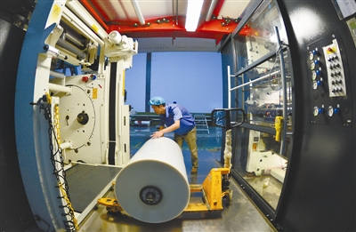 8月23日,工人在洪灾受损企业河北任县北人印刷有限公司车间内操作包装机械。