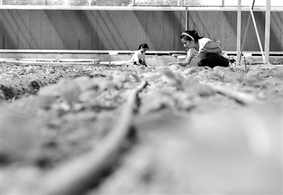 8月23日,洪灾受损企业河北任县捷如美农业科技开发有限公司的工人在育种大棚内工作。