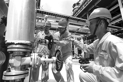 “秋老虎”发威,8月9日,在江苏新海石化催化装置操作现场温度达到50摄氏度,三名工人头顶烈日调度作业,保证成品油销售市场货源充足。