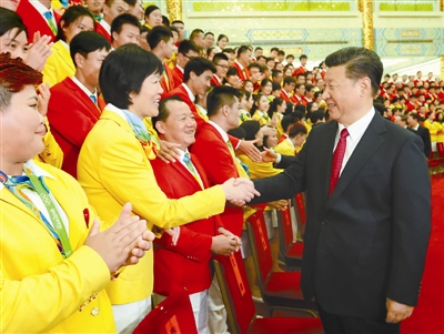 习近平强调,我们讲道路自信、理论自信、制度自信、文化自信。我们不以胜负论英雄,同时英雄就要敢于争先、敢于争第一。在奥运会这样高水平的竞争场合,争第一、拿金牌奖牌很不容易,拿到金牌奖牌的,值得尊敬和表扬。同时,只要勇于战胜自我、超越自我,即使没有拿到金牌奖牌,同样值得尊敬和表扬。所以我要说,这次拿了金牌奖牌的队伍和运动员,都是好样的。这次没拿到金牌奖牌,但在比赛中做了最好的自己的队伍和运动员,也都是好样的。中国女排不畏强手、英勇顽强,打出了风格、打出了水平,时隔12年再夺奥运金牌,充分展现了女排精神,全国人民都很振奋。我国体育健儿在里约奥运会上的表现,展示了强大正能量,展示了“人生能有几回搏”的奋斗精神。实现“两个一百年”奋斗目标、实现中华民族伟大复兴的中国梦,就需要这样的精神。要在全社会广泛宣传我国体育健儿在奥运会赛场上展现的拼搏精神,使之化为全党全国各族人民团结奋斗的强大精神力量。