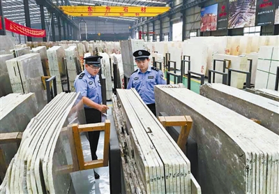 8月24日,天津海关打掉多个大理石专业走私团伙,查证涉案大理石80余万吨。专项行动查办系列案累计案值近14亿元,此案系海关总署一级挂牌督办案件。图为天津海关缉私办案人员正在清点大理石。