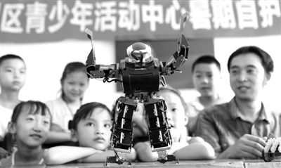 近日,重庆永川区青少年活动中心暑期科技小分队走进红炉镇周家院社区开展暑期自护教育活动,向山区的留守儿童展示科技文化魅力,并为他们带来了一场“科技盛宴”。图为第一次接触到机器人的孩子们,目不转睛地盯着正在跳舞的机器人。陈仕川 摄