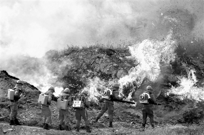 图为部队官兵奔向火场准备灭火。