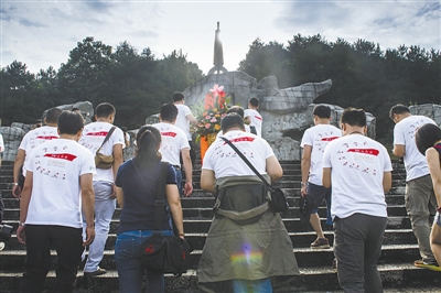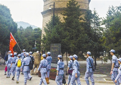 8月24日,延安宝塔山下,来自武汉一所高校的师生穿上红军的衣服,前来参观。