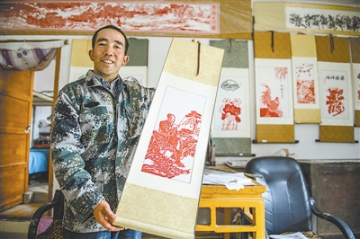 8月23日,宁夏隆德县红崖村老巷子,建筑工人杨国权展示他的剪纸作品。这里位于六盘山下,紧挨着红军第25军先遣团团部旧址。