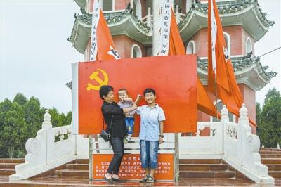8月23日,甘肃会宁县红军第一、二、四方面军会师旧址,一位奶奶带着两个孙子在会师纪念塔下合影。