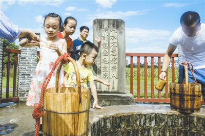 8月12日,江西省瑞金市沙洲坝红井旧址处,游客们争相品尝井水的甘甜。