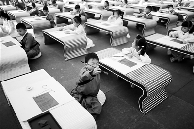 8月28日,108名即将上小学的儿童身着明代汉服,走进南京大报恩寺遗址公园参加开笔礼,在大报恩塔下通过朱砂点智、抽取孔子志向签、击鼓明志、学写“恩”字等仪式环节,寄托开启智慧、明确志向、早日成才等美好愿望。 泱波 摄/中新社