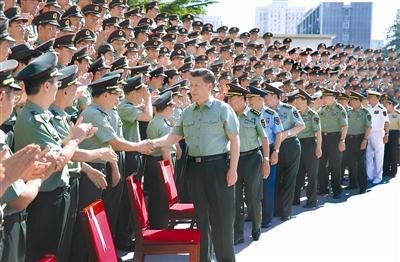 8月29日上午,中共中央总书记、国家主席、中央军委主席习近平视察战略支援部队机关,代表党中央和中央军委,对战略支援部队第一次党代表大会的召开表示热烈的祝贺,向战略支援部队全体指战员致以诚挚的问候。这是习近平亲切接见战略支援部队第一次党代表大会代表。 新华社记者 李刚 摄