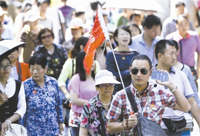8月24日,国家旅游局在哈尔滨召开全国导游体制改革试点工作会议。其中,最受关注的是,国家旅游局在江苏、浙江、上海、广东启动线上导游自由执业试点,游客今后能像网约车一样“网约”导游。图为游客在导游的带领下在南京中山陵游玩。 泱波 摄/中新社