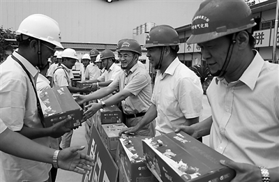 8月30日,在中铁电气化局商合杭铁路亳州南制梁场,局党委和工会将防暑降温品送到在工地绑扎钢筋的农民工手中。