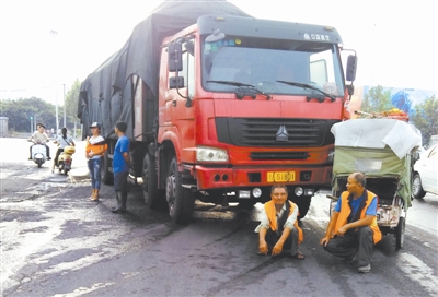 8月30日,郑州市西四环与化工路交叉口附近,在此清扫马路的环卫工一怒之下将从此经过的4辆拉煤车拦下,并对司机进行斥责。几名拉煤车司机面对指责一阵挠头。