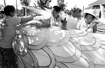 8月30日,安徽省巢湖市烔炀镇月亮湾湿地公园临时搭建的生产工棚内,70余名来自四川自贡的传统民间扎彩工艺人正加班加点制作加工各类彩灯,迎接9月8日在这里举行的2016巢湖大型彩灯嘉年华文化盛宴。