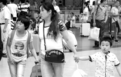 8月29日,江苏省苏州市,家长带着小孩在苏州火车站准备乘车返乡。开学在即,铁路运输迎来了“小候鸟”返乡高峰。在暑假“飞”到苏州与父母团聚的“小候鸟”们踏上归程,准备迎接新学期的开始。