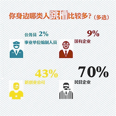 哪类人跳槽比较多?民营企业员工遥遥领先其他人群,占比达到70%;紧随其后的是新创业公司员工;然后才是国有企业以及公务员、事业单位编制人员。