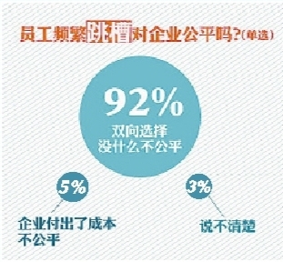 员工频繁跳槽对企业公不公平?高达92%的网友认为这是“双向选择,没什么不公平”;5%的网友表示“企业付出了成本,不公平”;还有一部分网友表示“说不清楚”。