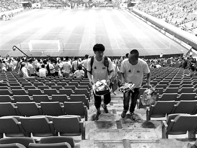 比赛结束后,球迷的情绪因为输球多少有点沮丧,但依然不忘记收走脚下垃圾。有现场球迷表示,“这比中国足球的崛起有意义一万倍。” 现场负责安保的韩国人也对中国球迷的素质“点赞”。 甘源 摄