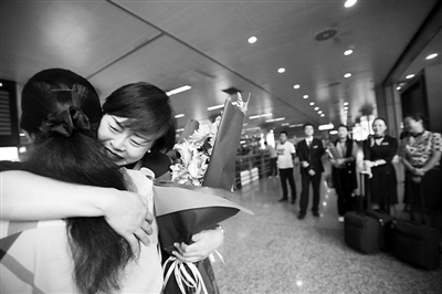 9月4日,山西太原,“60后”空嫂吕为民与同事惜别。当日,随着东航MU5420航班在太原武宿机场徐徐落地,“60后”空嫂吕为民也在同事们的依依惜别中为自己的20年空嫂飞行生涯画上一个圆满的句号。张云 摄/中新社