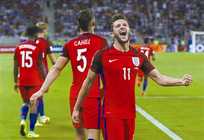 9月4日,英格兰队球员拉拉纳(前)进球后庆祝。