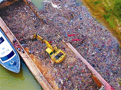 9月4日,广西藤县,在珠江上游——广西浔江河段,装载垃圾船只已经被当地有关部门查获,目前正停靠在原地。9月3日晚,一艘船从广东省东莞市将400吨生活垃圾运至藤县浔江丽新村登州头河段,并开始向河道内大量倾倒垃圾。所幸当地群众及时发现并举报,相关部门赶到制止了这种恶劣行为,并控制了船上人员。