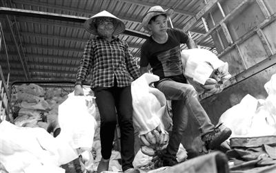 9月5日,在凭祥市浦寨边贸区,中越边民在搬运香蕉。