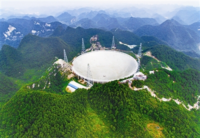 9月7日,已经完成反射面板安装的FAST矗立在群山中。