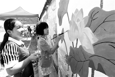 9月4日,浙江省金华市,60多名农村娃和家长用画笔和斑斓的色彩,在后宅街道曹村的农家院墙上作画,画出心中的家乡景色。当天,首届后宅荷花节涂鸦大赛正在进行。在作画现场,一些参赛者可谓是全家动员,以墙画扮靓美丽乡村。