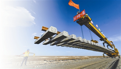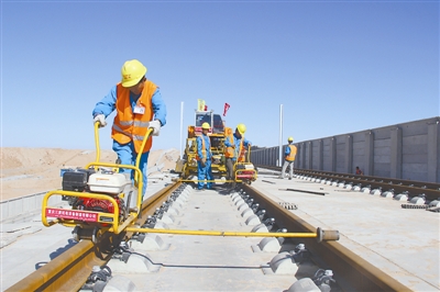 ——乌准铁路广大员工在极其艰苦的茫茫沙漠中,众志成城,迎难而上,修建了高标准高质量的跨区间无缝线路。