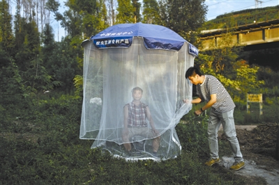 8月3日,昆明,工作人员钻进蚊帐当诱饵,裸露手臂和腿,引诱蚊子飞入帐内。