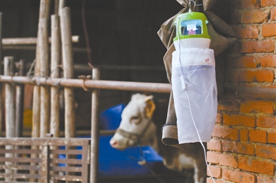 工作人员将带来的诱蚊灯拴在牛圈顶上,固定在牛食槽的上方。接通电源后,诱蚊灯立即散发出紫色柔光,利用蚊子的趋光性及对特殊波长的敏感性,引诱成蚊扑灯。