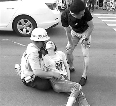 照片中,一位民警坐在马路中间,让一名昏迷的女子斜靠在他的腿上,民警用左手托着女子的颈部,一脸焦急地对着对讲机喊话。