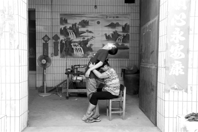 9月2日,在河南省洛阳市偃师市首阳山镇香峪村,母亲刘延玲坐在凳子上,用小腿勾着患脑瘫的儿子马博文的脚,头顶住他的腰做拉伸动作,按摩肌肉,活动筋骨。