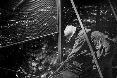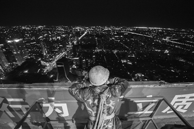 ① 一名参加顶升工作的工人在工作平台上眺望北京城夜景。